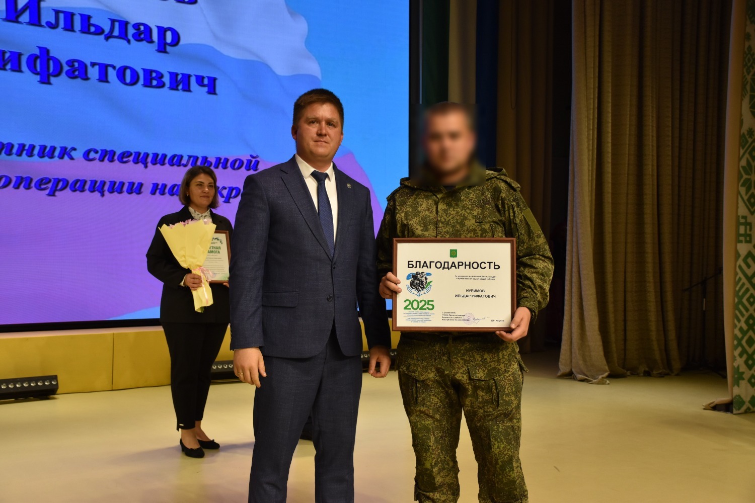 Благодарностью Администрации муниципального района Аскинский район за успешное выполнение боевых задач и приближение нашей общей Победы награждён участник специальной военной операции, находящийся в краткосрочном отпуске, командир разведывательной роты, лейтенант Нуримов Ильдар Рифатович.